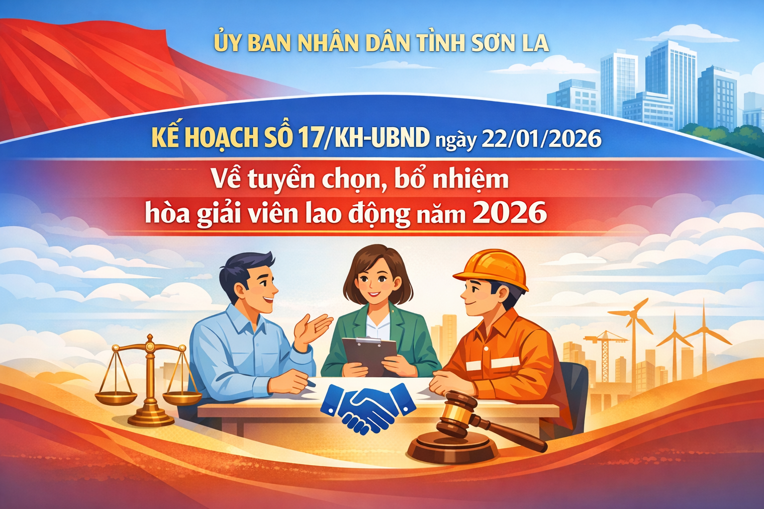 Ngày 22/01/2026, UBND tỉnh Sơn La ban hành Kế hoạch số 17/KH-UBND về tuyển chọn, bổ nhiệm hòa giải viên lao động năm 2026. Kế hoạch nhằm tuyển chọn, bổ nhiệm đội ngũ hòa giải viên lao động có đủ phẩm chất đạo đức, năng lực, trình độ chuyên môn để tham gia giải quyết các tranh chấp lao động và thực hiện hòa giải tại cơ sở, qua đó góp phần xây dựng quan hệ lao động hài hòa, ổn định và tiến bộ trên địa bàn tỉnh.